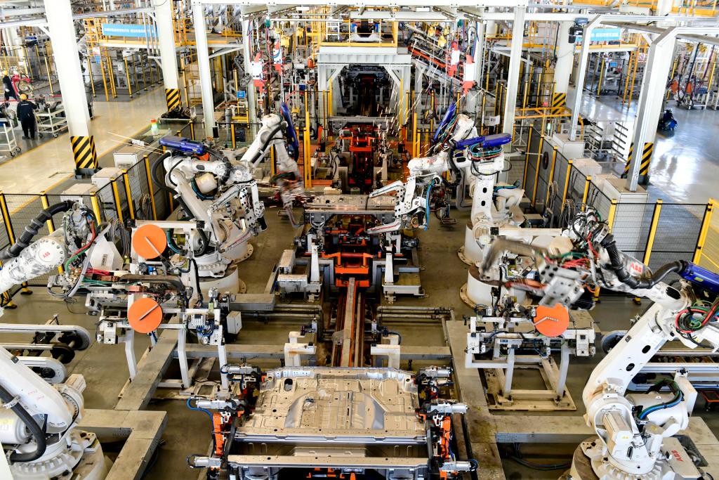 1月9日,在位于日照市五蓮縣的五征集團(tuán)汽車焊裝車間,工業(yè)機(jī)器人在焊裝車身。新華社記者郭緒雷攝